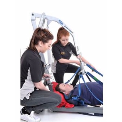The Floor to Seat System was designed to address a problem identified through an investigation into incidents of unsafe handling by Gwynedd Council. It was discovered that staff were unsure of what sling to use to lift the fallen person and had an understandable worry of causing harm to the already distressed and anxious person by selecting the wrong style and size of sling. To address this problem we developed a sling specically for the purpose of lifting the fallen person, a sling that would be suitable for the majority of people, and also compatible to use with standard hook style hoist. Working closely with Gwynedd Council’s moving and handling team a pack has been developed which includes, the Floor to Seating Sling, 4 pillows, and a non-slip seat cover. As well as supporting the person comfortably for hoisting the Floor to Seating Sling can also be used to move the person comfortably and safely on the floor to a more suitable space before hoisting.