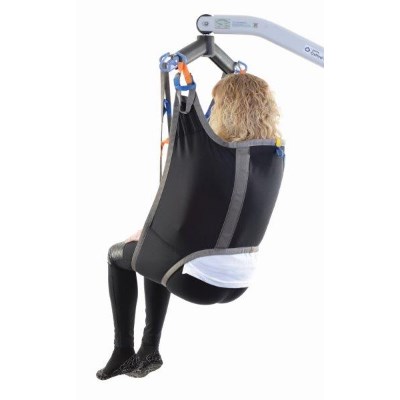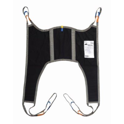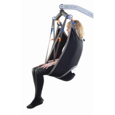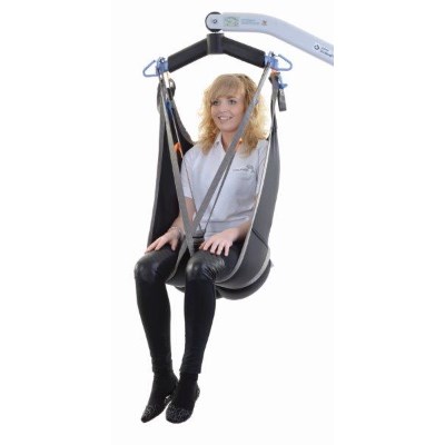 The ‘arms in’ design alleviates under-arm and shoulder pressure. This sling has removable ‘bones’ to the back section offer added support. There is an adjustable elasticated body belt for added support and security and padded leg sections for additional comfort. With discreet colour coded tab on top section to denote size and coloured attachment loops which promote correct/safe positioning. Can be customised to fulfil patient specific needs.